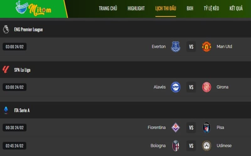 - Cập nhật lịch thi đấu liên tục: Mitom TV không chỉ phát sóng trực tiếp mà còn cung cấp lịch thi đấu chi tiết, giúp bạn chủ động sắp xếp thời gian.