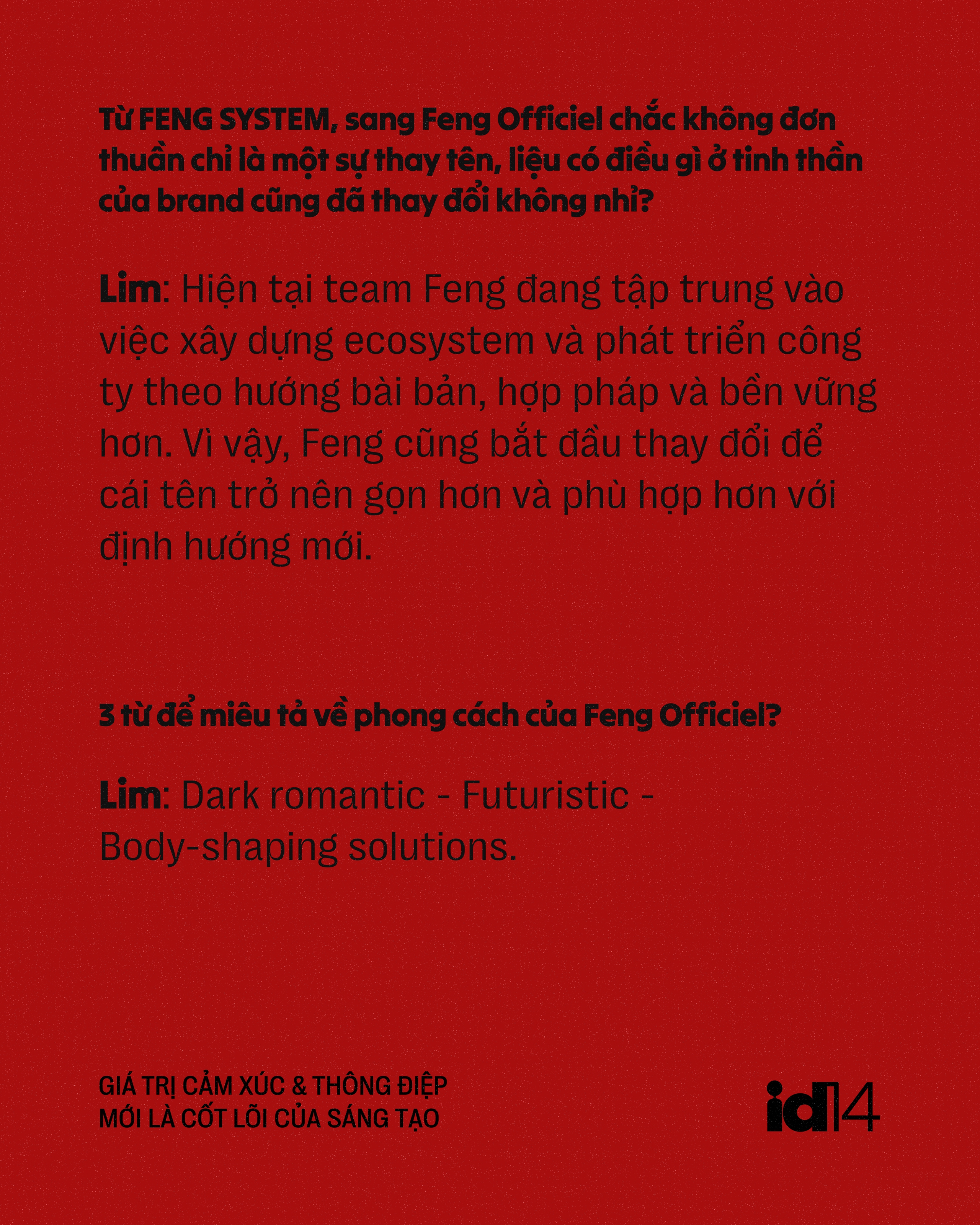 Mục tiêu hiện tại của Lim là hệ thống lại những trải nghiệm và kiến thức mình có trong thời gian tới, để team FENG cũng có thể nhận được những đãi ngộ và môi trường làm việc tốt như cách các thương hiệu lớn trên thế giới đang làm với nhân sự của họ.