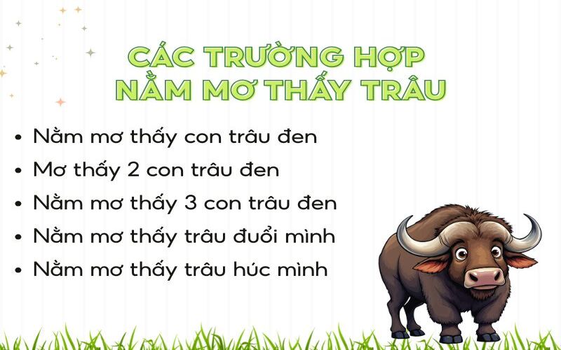 Nếu giấc mơ liên quan đến trâu sinh con, các con số 26 hoặc 62 thường được gợi ý. Trường hợp hai con trâu đối đầu nhau, con số 11 hoặc 88 hay được liên hệ. Còn nếu bạn mơ thấy mình cưỡi trâu, 15 hoặc 63 là những con số thường được nhắc tới.